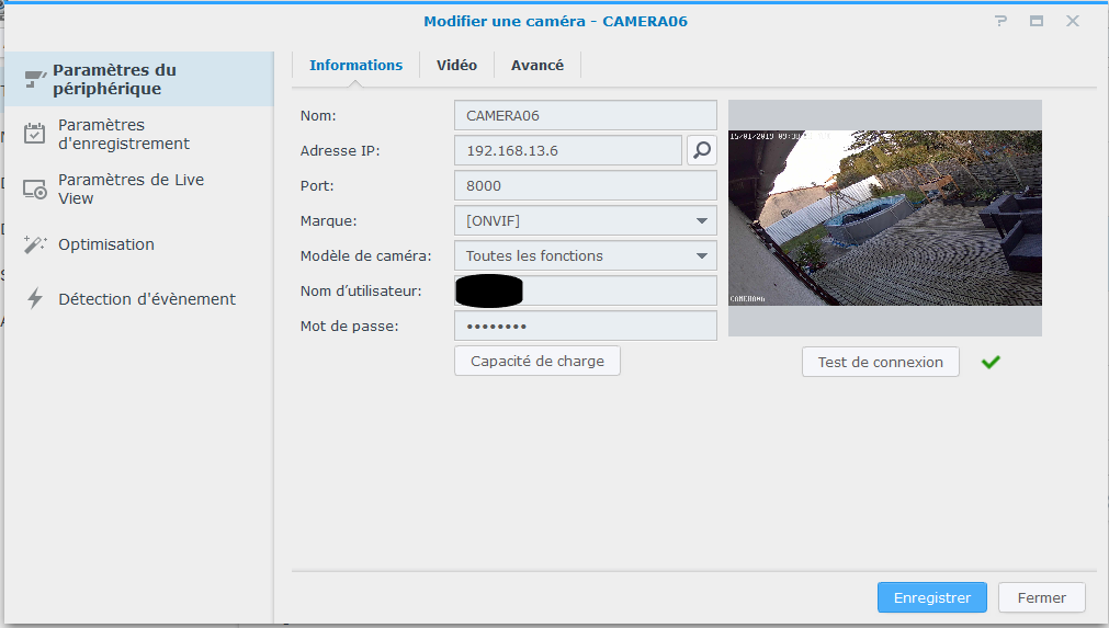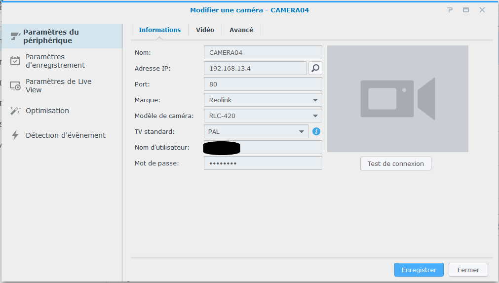 Un petit coup sur le bouton « Test de connexion » pour vérifiez que vous vous connectez bien sur la caméra